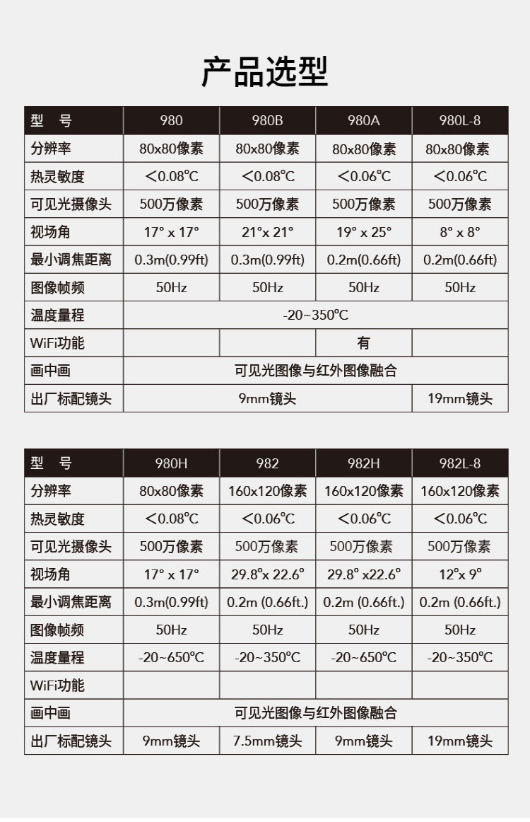 標配鏡頭7.5mm,分辨率80×80,IFOV:3.77mard,視場角17×17°,熱靈敏度NETD<0.06℃,圖像幀頻50Hz,溫度范圍(-20-150、0-650),可見光分辨率500萬像素